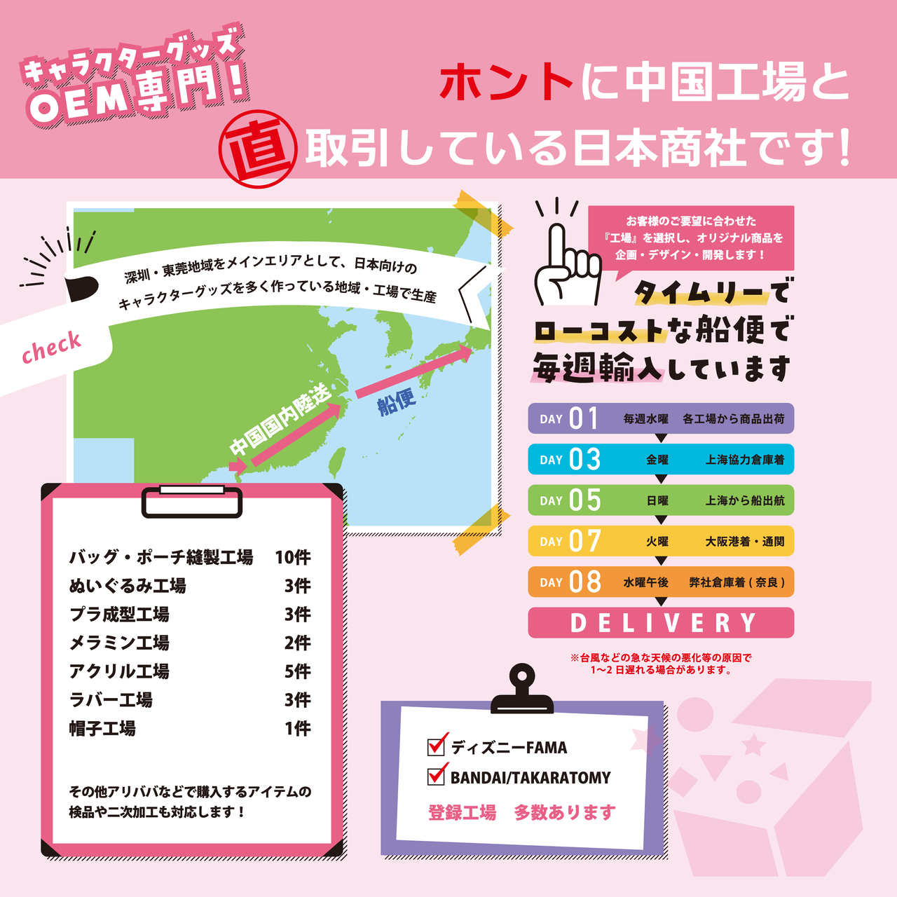 キャラクターグッズ・オリジナルグッズの製作には20年以上の実績があり、キーホルダー・ストラップ・バッグ・ポーチ・ぬいぐるみ・ソックス・プラスチック雑貨・食器類など、多様な生活雑貨全般のオリジナルグッズの製作をお手伝いさせていただきます。